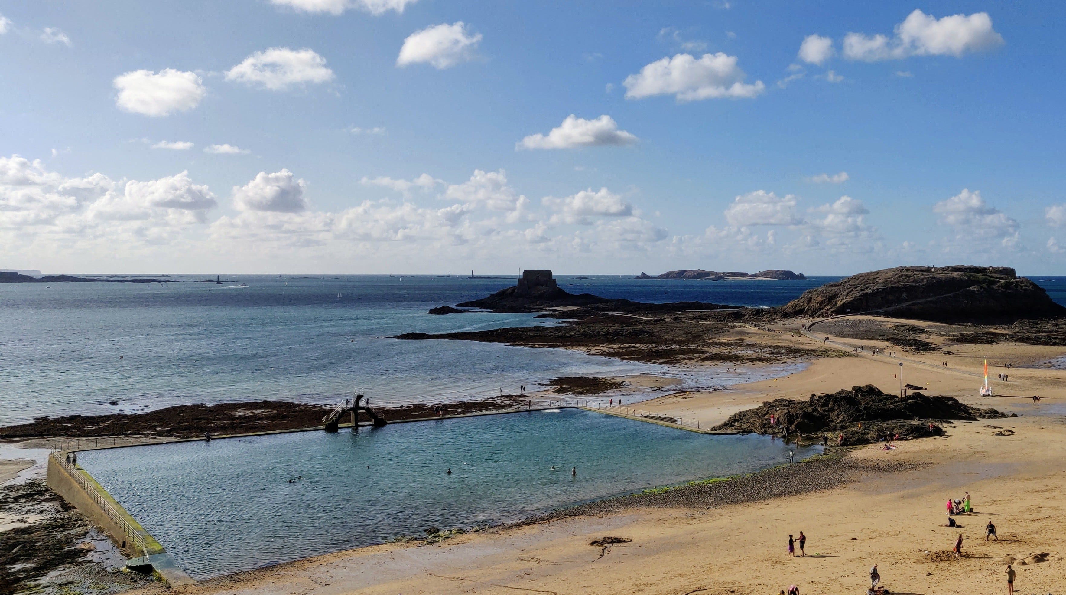 This part of Brittany has an extremely large tidal range, which made it a great location for the world’s first tidal power station. It also makes for good swimming. This is a tidal swimming pool in Saint-Malo that I came across today. As the tide comes in the sea immerses the pool, which stays full of seawater as the tide recedes. I thought that was pretty cool.